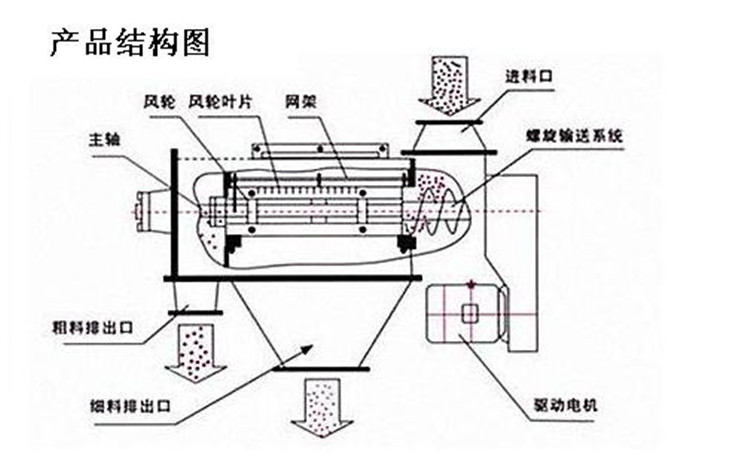 本設(shè)備篩網(wǎng)為圓筒狀,置于機(jī)體內(nèi),物料通過螺旋輸送系統(tǒng)后,和氣流混合、霧化進(jìn)入網(wǎng)筒內(nèi);通過網(wǎng)筒內(nèi)風(fēng)輪葉片使物料同時(shí)受離心力和旋風(fēng)推進(jìn)力,從而迫使物料噴射過網(wǎng),由細(xì)料排出口排出,不能過網(wǎng)的物料沿筒壁從粗料排出口排出。